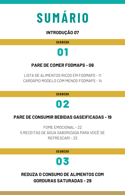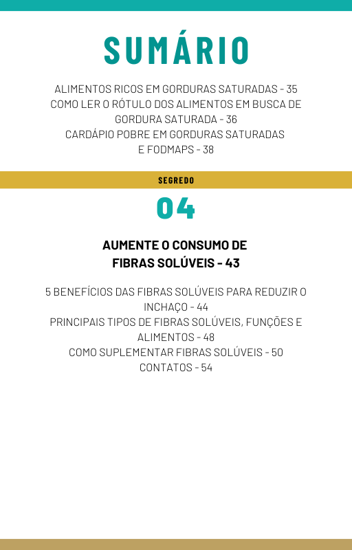Você terá acesso à lista de alimentos ricos em FODMAPs, dos alimentos ricos em fibras solúveis, dois cardápios elaborados para facilitar seu dia a dia e orientações sobre como escolher os melhores alimentos apenas lendo os rótulos.